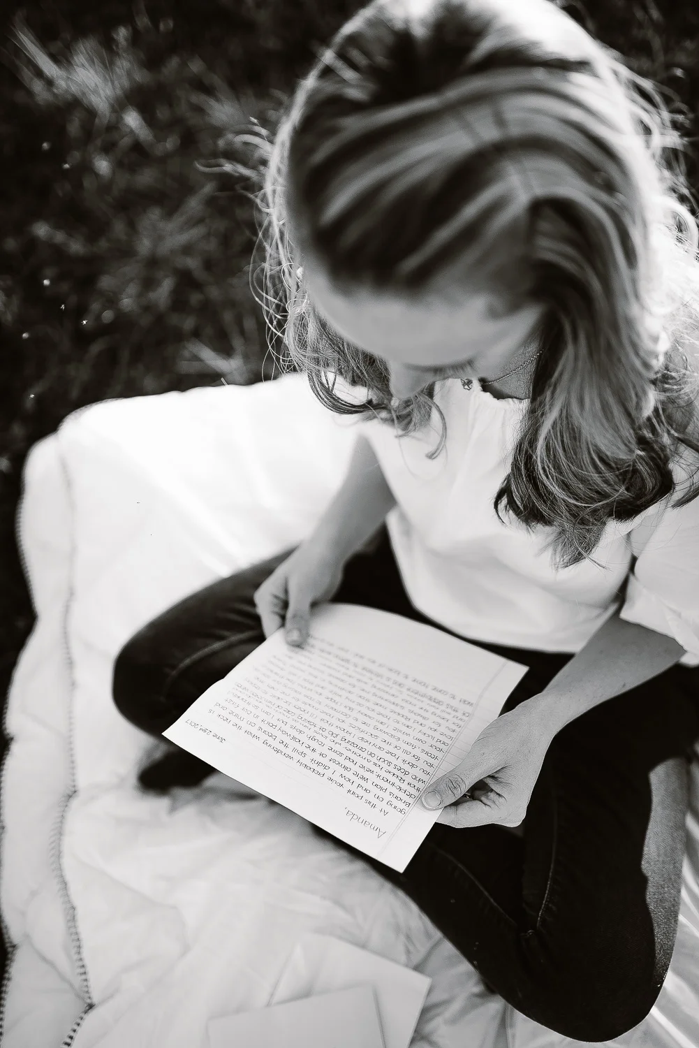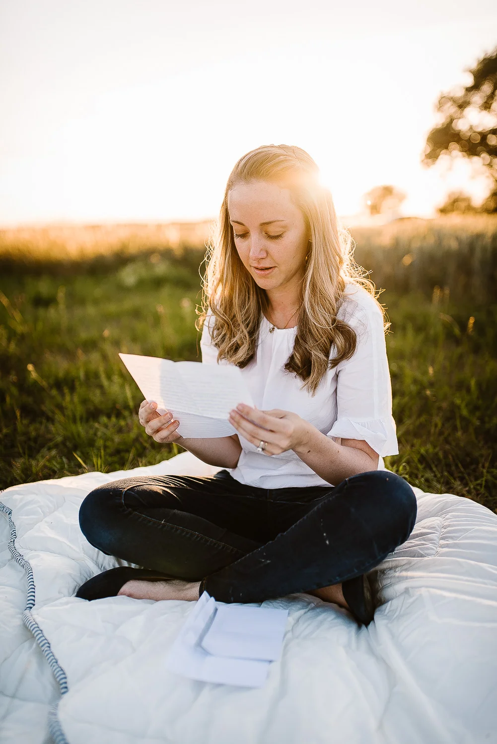 A woman sitting cross-legged on a white blanket outdoors, reading a letter during sunset in a grassy field.