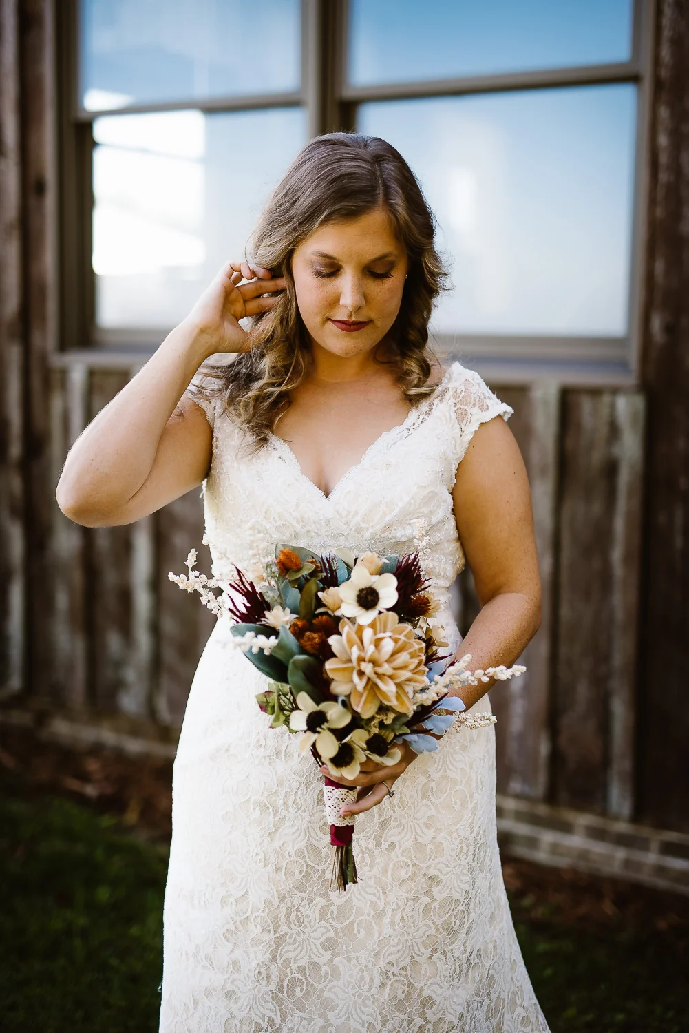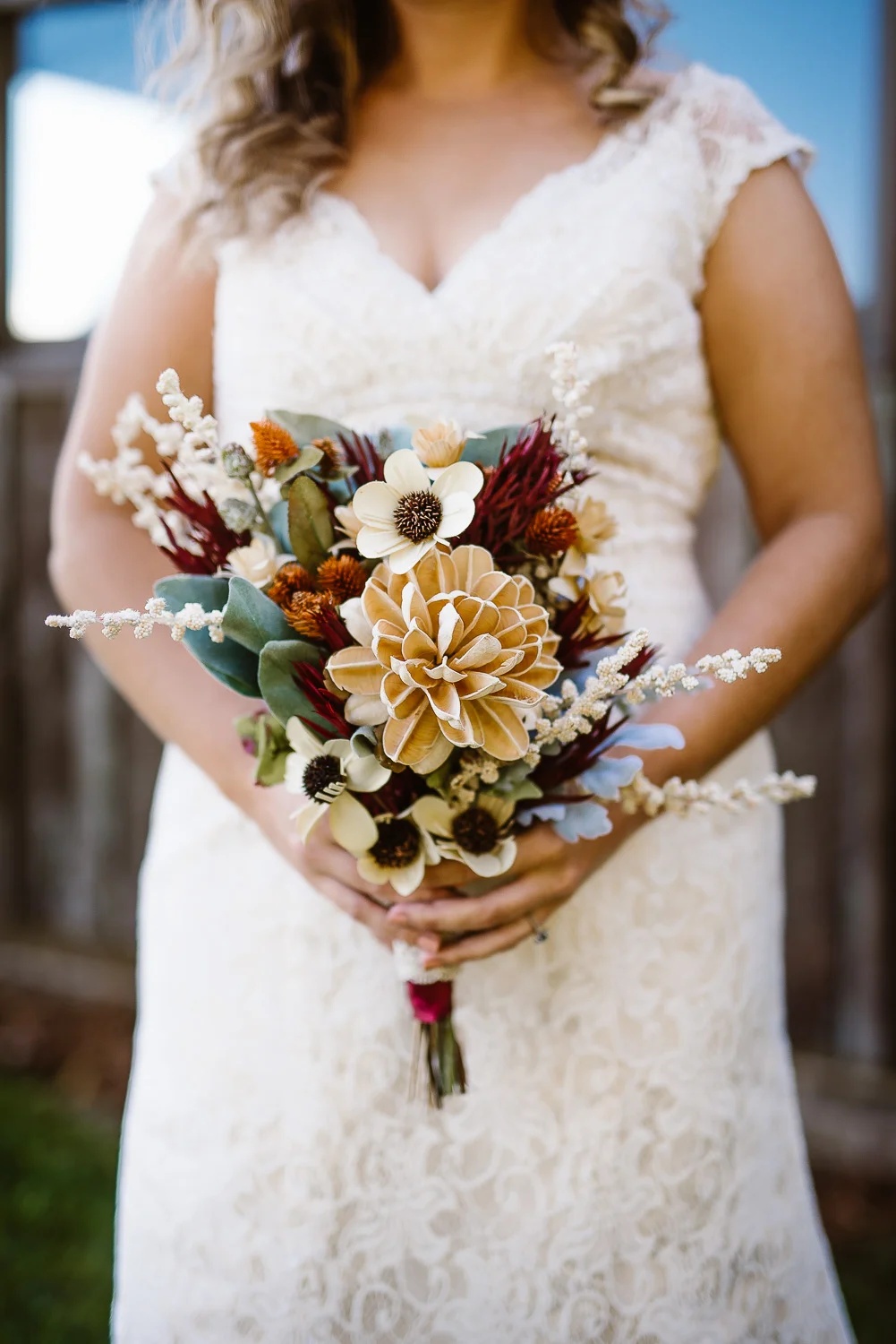 Bride wearing lace wedding dress holding bouquet of white, beige, and dark red flowers with green leaves, in front of a wooden fence.