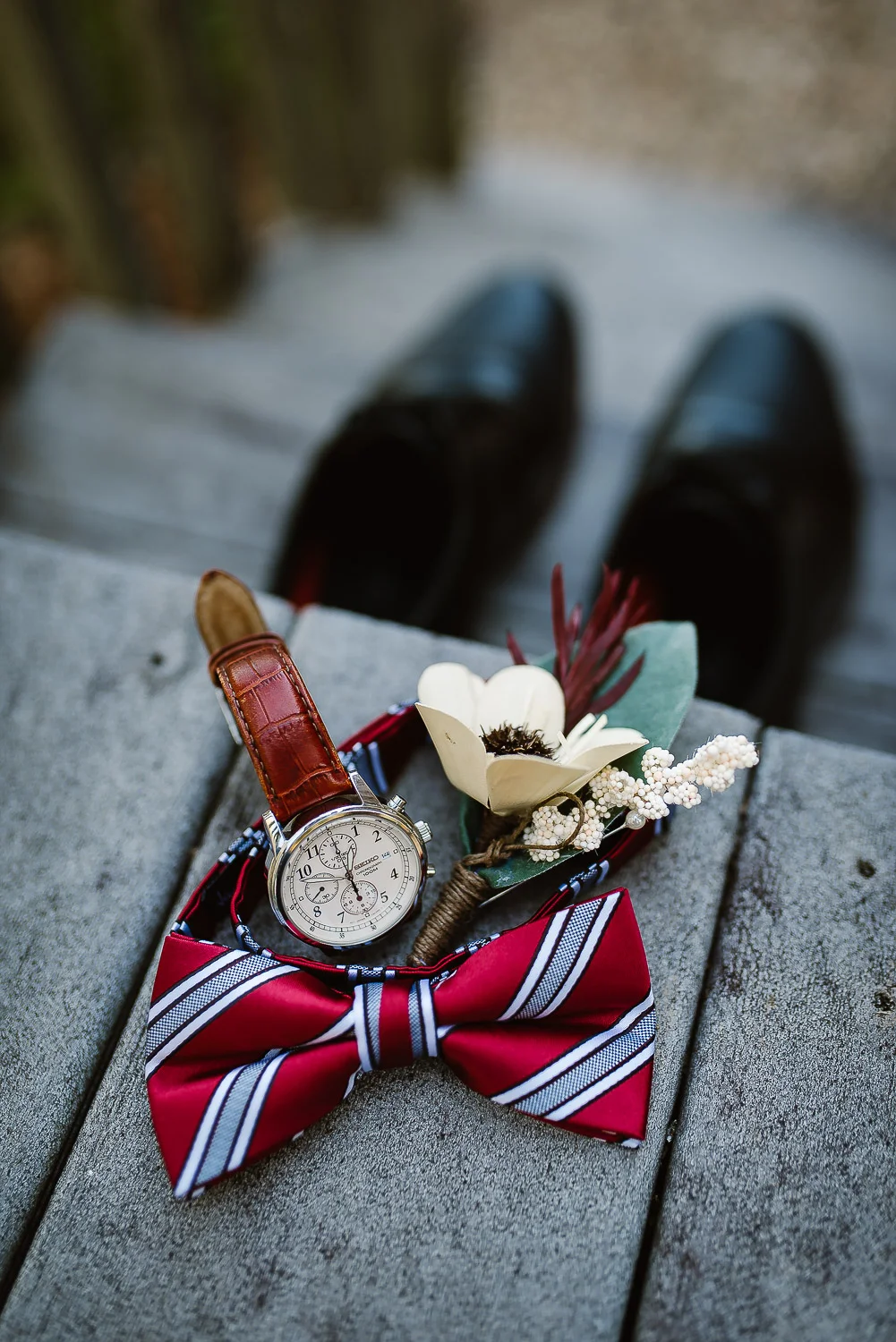 A pair of black formal shoes, a red and gray striped bow tie, a wristwatch with a brown leather strap, a small boutonniere with white and red flowers and greenery, and a wedding band, all arranged on a wooden surface. View fullsize