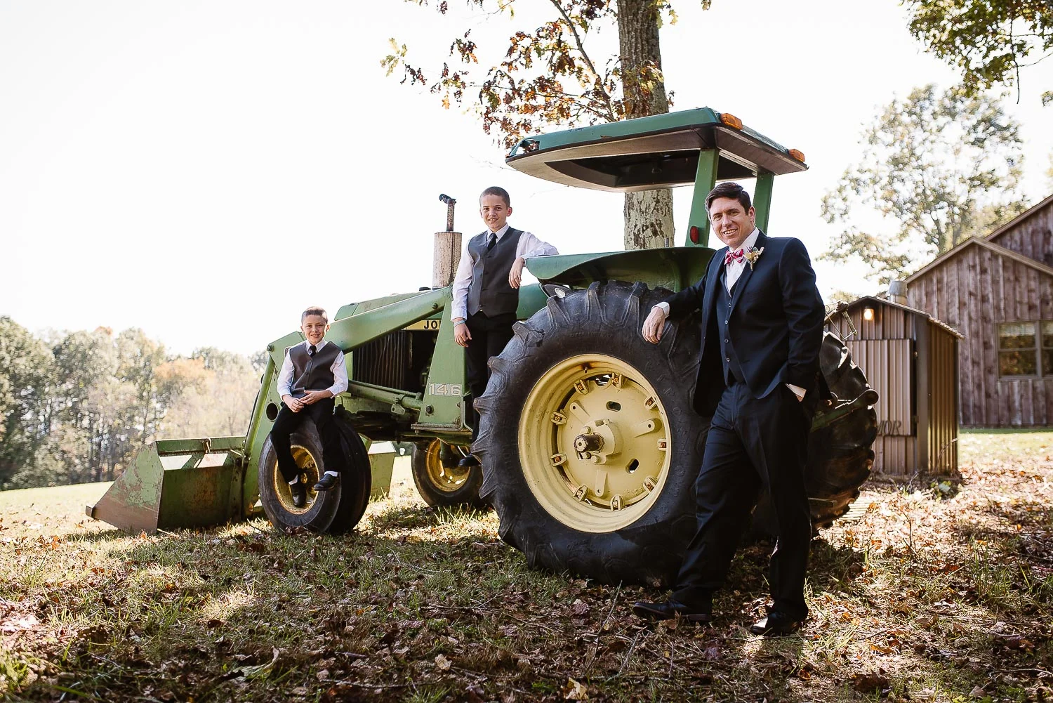 Three men in suits and vests, possibly father and two sons, posing outdoors with a large green tractor near a rustic wooden building and trees.