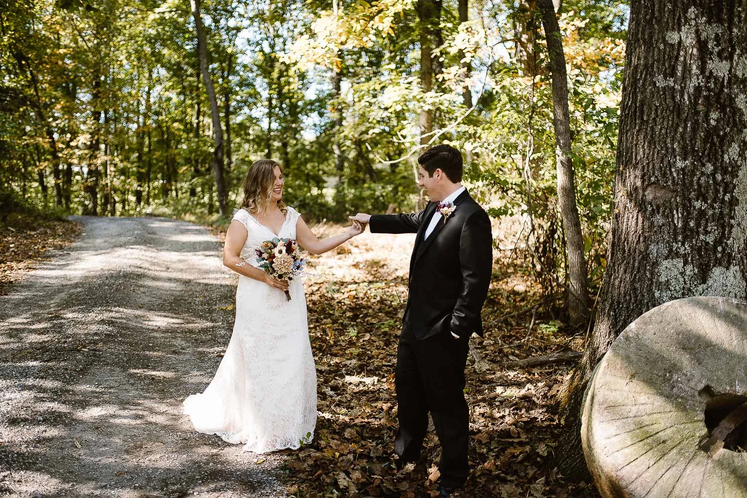 A bride and groom walk hand in hand along a wooded trail, dressed in wedding attire, with the bride holding a bouquet of flowers and both smiling at each other.