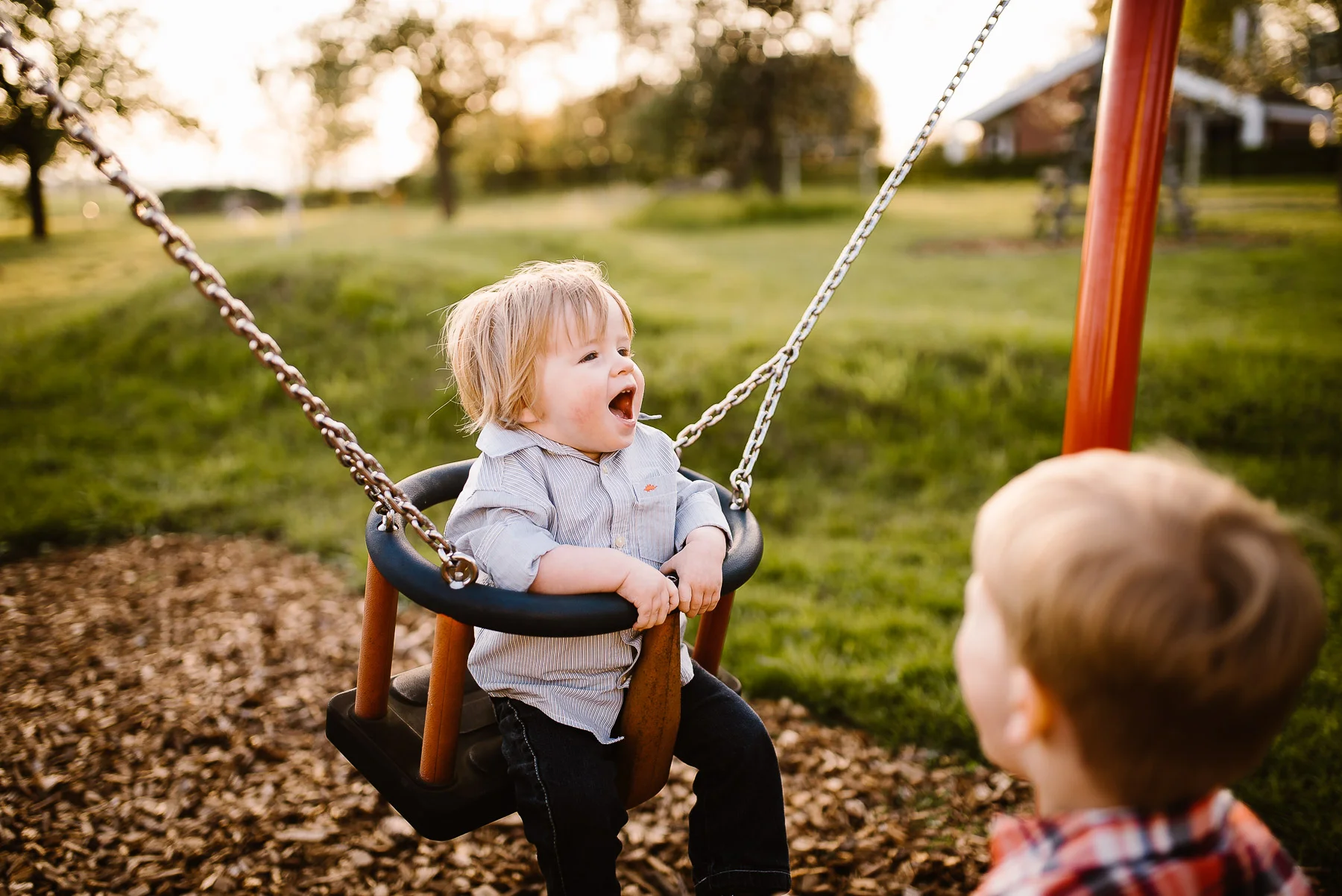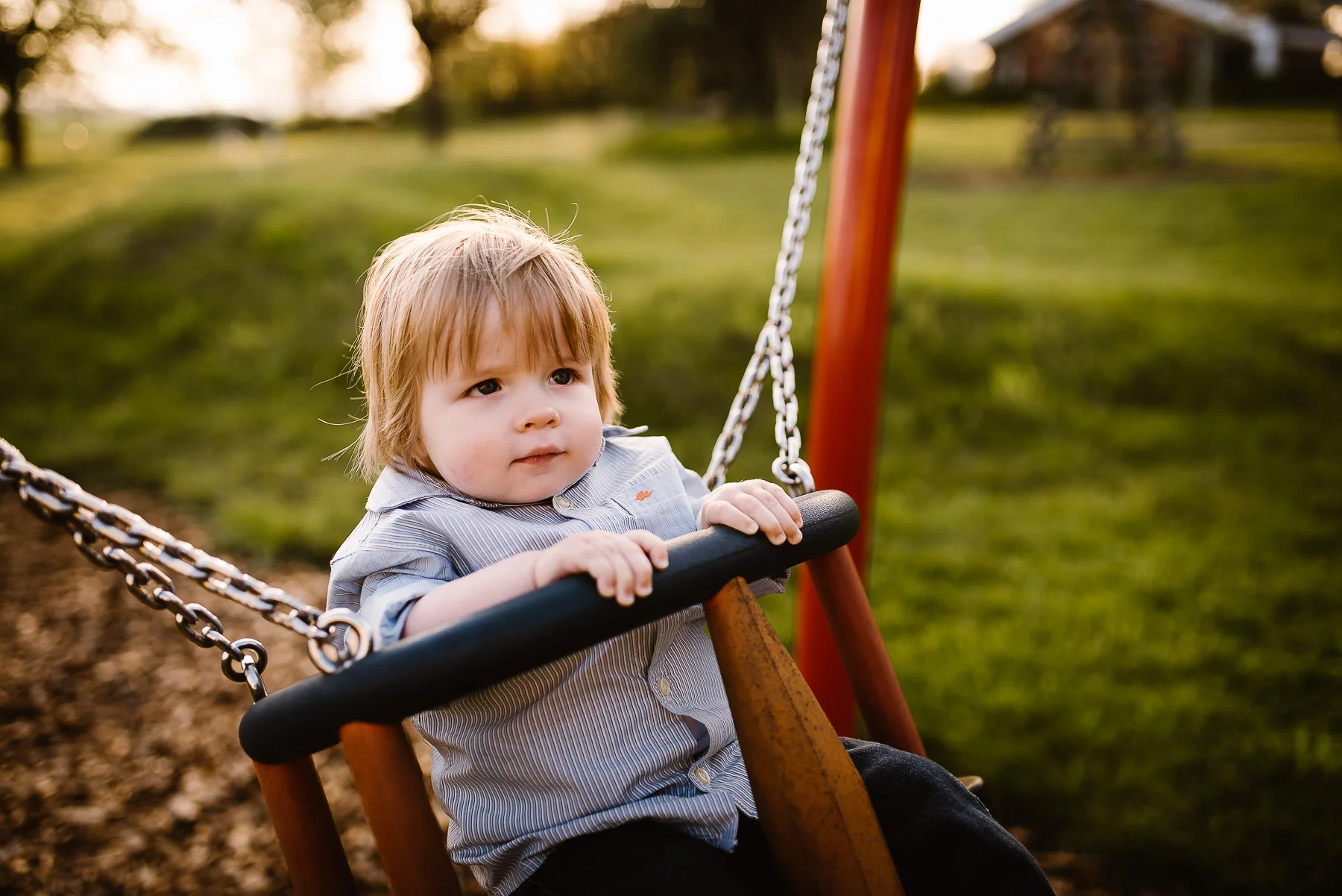 A young child with light brown hair and fair skin sitting on a swing at a playground during sunset, holding onto the black safety bar with a grassy outdoor area and trees in the background.