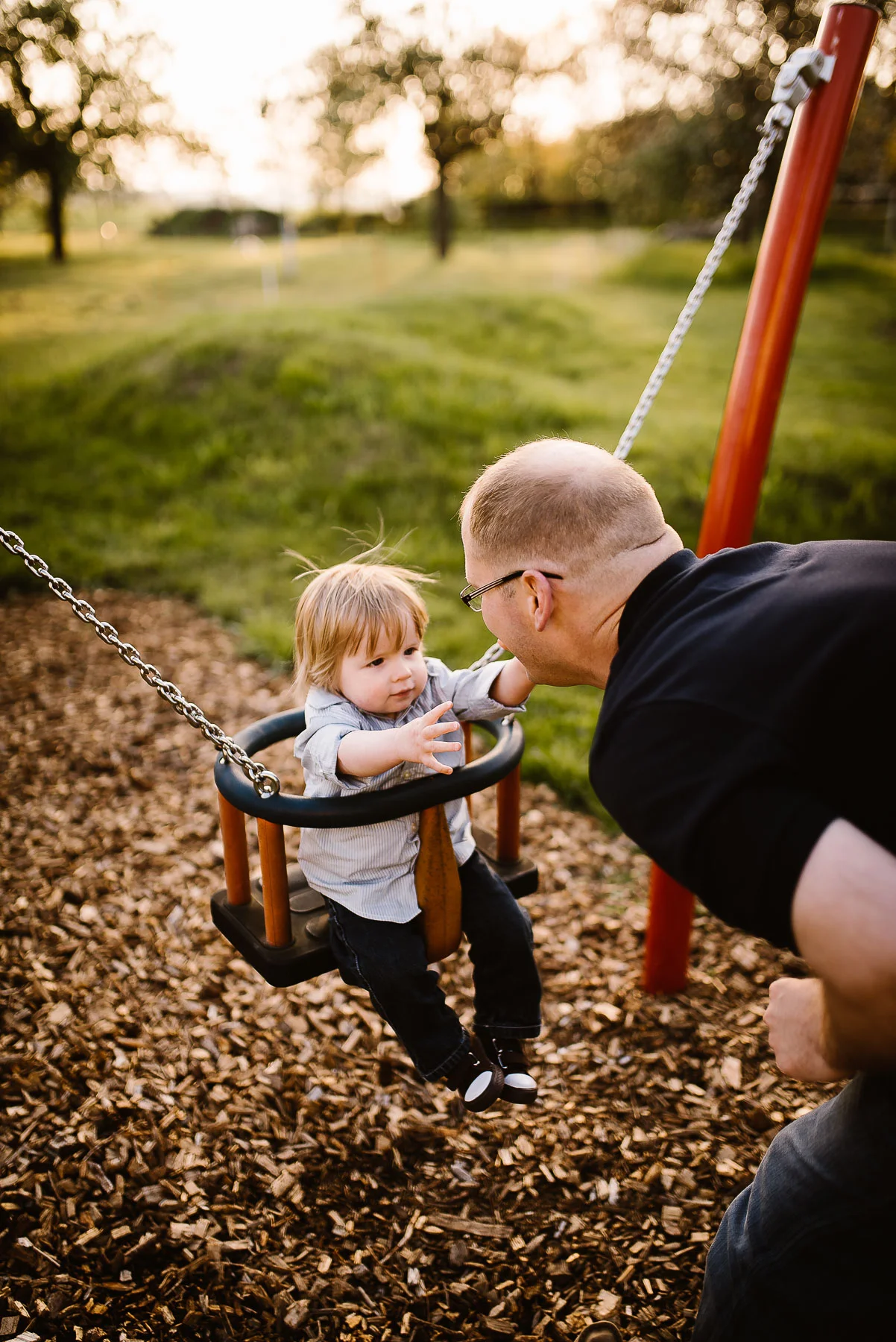 A toddler girl in a baby swing at a park, reaching out to an adult man leaning toward her, with trees and a sunset in the background. View fullsize